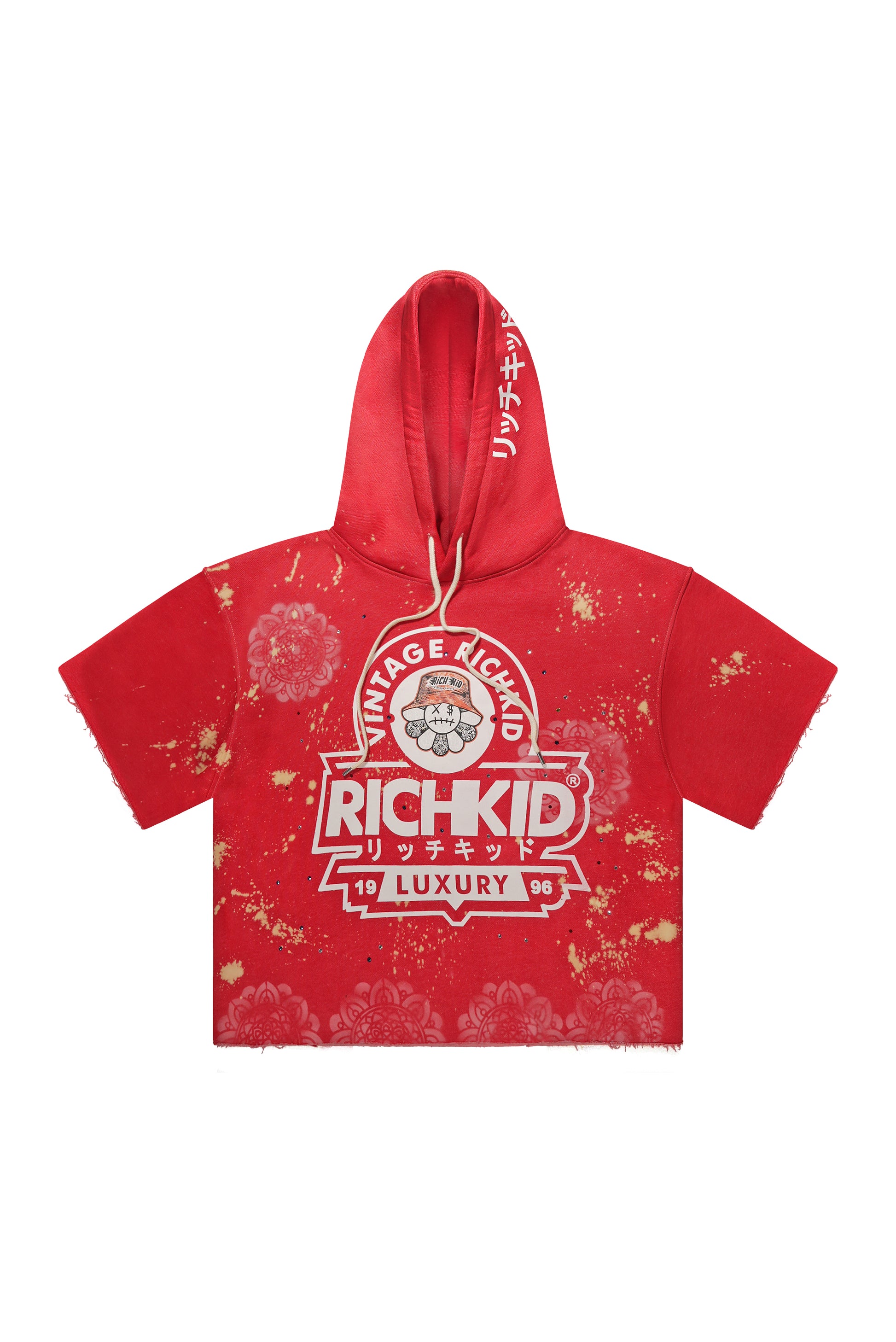 This heavyweight red hoodie, crafted from 500 GSM cotton, offers exceptional durability and comfort. Featuring a bold spray-painted design with rhinestones alongside the classic RichKid Tag logo, it combines streetwear edge with premium quality—ideal for those seeking style and lasting wear in one.
